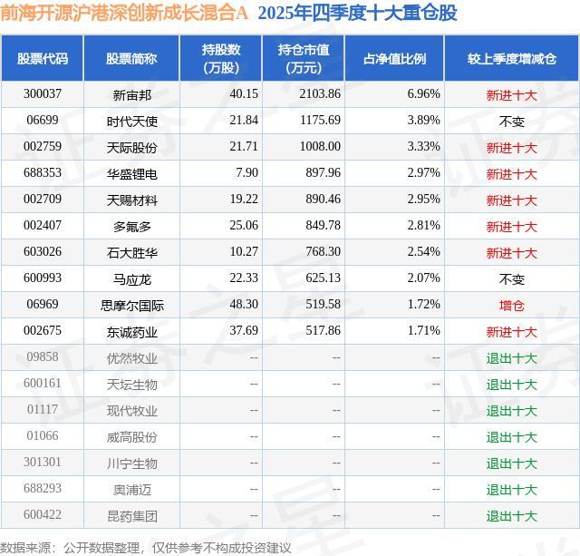 根据2025基金年报公募基金重仓股数据,重仓该股的公募基金共3家,其中持有数量最多的公募基金为前海开源基金的前海开源沪港深创新成长混合A。前海开源沪港深创新成长混合A目前规模为2.17亿元,最新净值1.48(4月13日),较上一交易日上涨0.2%,近一年上涨7.56%。该公募基金现任基金经理为章俊。章俊在任的基金产品包括:前海开源祥和债券A,管理时间为2021年3月12日至今,期间收益率为35.5%;前海开源裕瑞混合A,管理时间为2021年12月28日至今,期间收益率为-5.92%;前海开源沪港深汇鑫混合A,管理时间为2024年4月24日至今,期间收益率为17.46%。